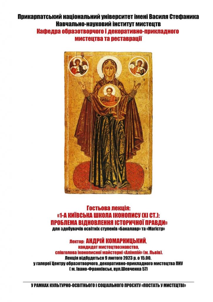 9 лютого 2023 р. у галереї Центру образотворчого, декоративно-прикладного мистецтва Прикарпатського національного університету імені Василя Стефаника відбулася гостьова лекція кандидата мистецтвознавства, співголови іконописної майстерні «Алімпій» Андрія Комарницького (м.Львів) на тему: «Перша Київська школа іконопису (ХІ ст.): проблема відновлення історичної правди» Читати далі