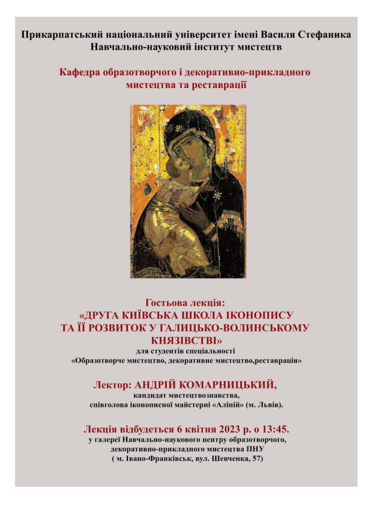 ЗАПРОШУЄМО НА ГОСТЬОВУ ЛЕКЦІЮ АНДРІЯ КОМАРНИЦЬКОГО “ДРУГА КИЇВСЬКА ШКОЛА ІКОНОПИСУ ТА ЇЇ РОЗВИТОК У ГАЛИЦЬКО-ВОЛИНСЬКОМУ КНЯЗІВСТВІ”
