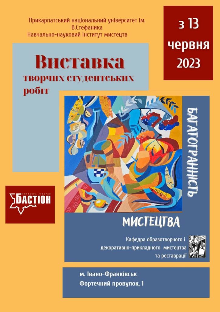 Кафедра образотворчого і декоративно-прикладного мистецтва та реставрації запрошує до перегляду виставки творчих робіт студентів четвертого курсу кафедри образотворчого і декоративно-прикладного мистецтва та реставрації зі спеціалізації «Малярство», «Графіка», «Іконопис», «Текстиль», «Скульптура» у фортечній галереї «Бастіон» за адресою Івано-Франківськ, Фортечний провулок 1.