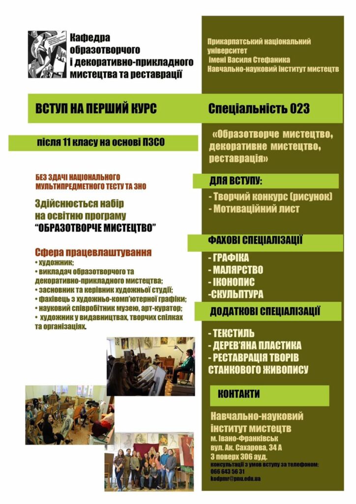 Кафедра образотворчого і декоративно-прикладного мистецтва та реставрації оголошує проведення Всеукраїнського конкурсу студентських творчих робіт на тему «Ескізний проєкт пам’ятника Квітки Цісик» для студентів профільних професійно-технічних і вищих навчальних закладів культури і мистецтв. З детальною інформацією про умови участі у конкурсі Читати далі