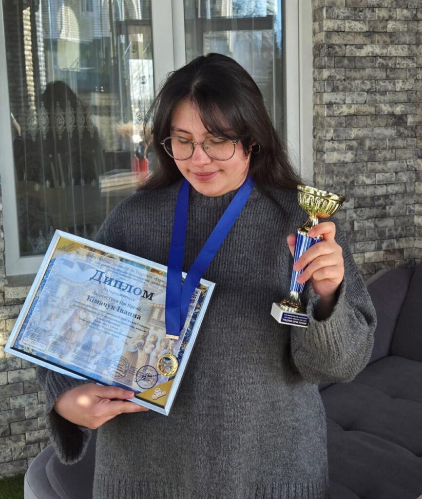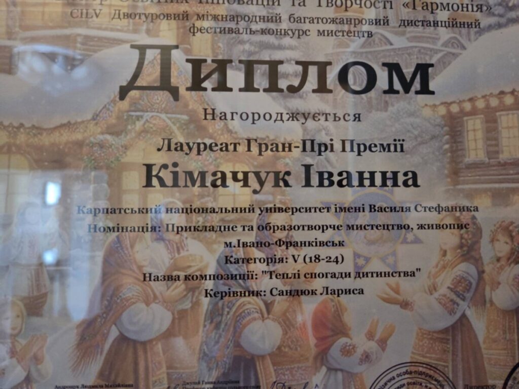 Вітаємо нашу студентку з перемогою у конкурсі! Вітаємо Кімачук Іванну – студентку 2 курсу кафедри образотворчого і декоративно-прикладного мистецтва та реставрації КНУВС з перемогою (Гран-прі) в міжнародному двотуровому багатожанровому конкурсі «Гармонія»! Керівник: ст. викладач Сандюк Л. П.