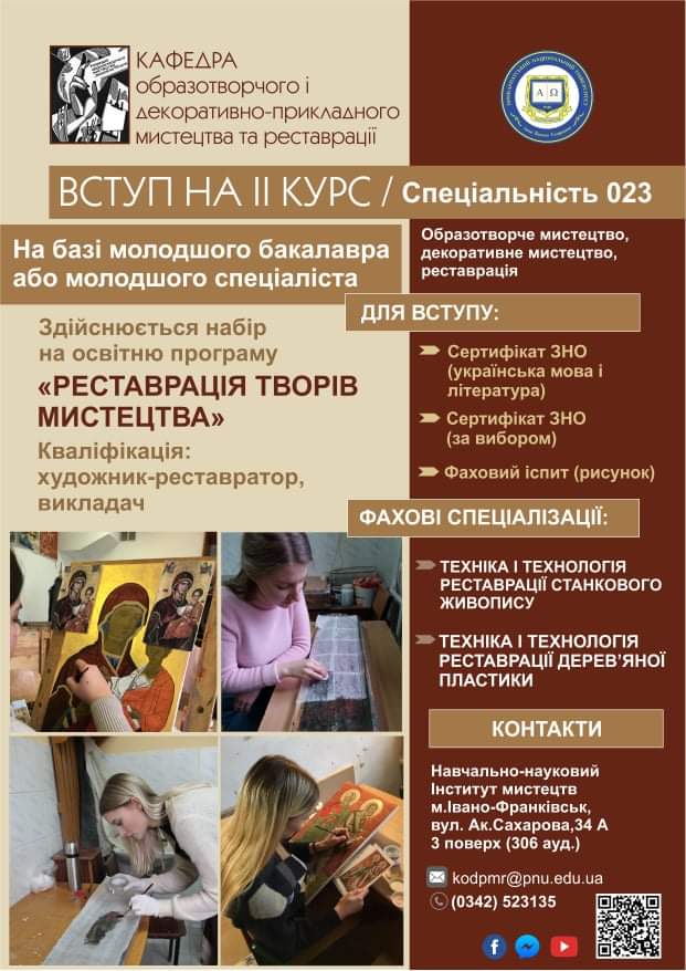 Кафедра образотворчого і декоративно-прикладного мистецтва та реставрації щиро запрошує вступників здобути освітні ступені “Бакалавр” та “Магістр” за спеціальністю “ 023 Образотворче мистецтво, декоративне мистецтво, реставрація”. Прийом на І курс (після 11 класу на основі ПЗСО) для здобуття освітнього рівня “Бакалавр” Читати далі